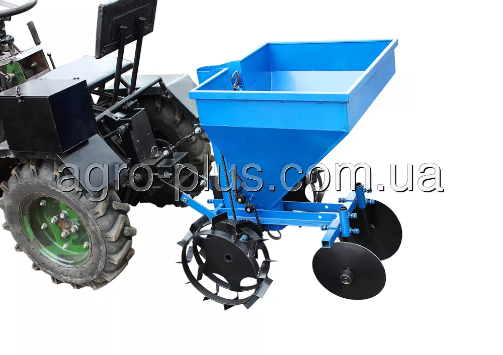 - Прицепное устройство, картофелесажалка, приводные колеса – 2 шт., дисковые окучники – 2шт., сошник килевидного типа.