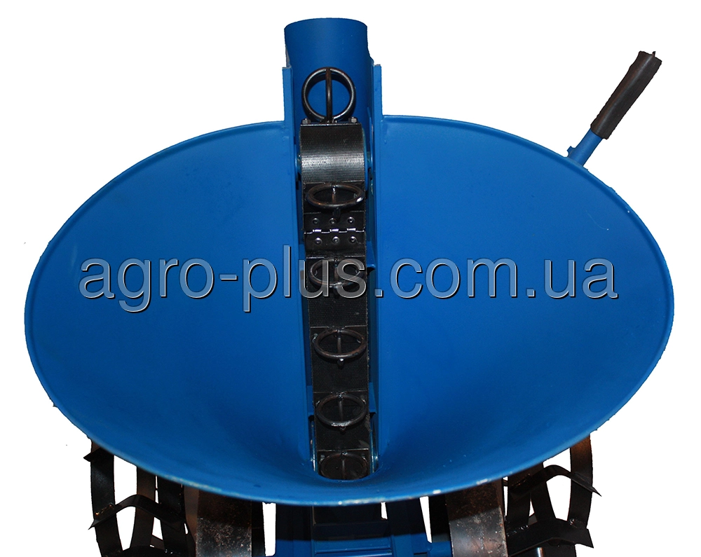 Для загортания посаженого картофеля и создания грунтового гребня на раму из стального уголка 32х32х3 мм, установлены регулируемые дисковые окучники диаметром 275 мм и толщиной 2 мм. Плавное и надежное вращение каждого диска обеспечивает пара 202 подшипников.