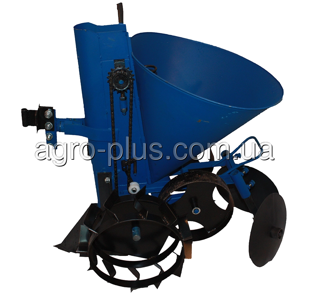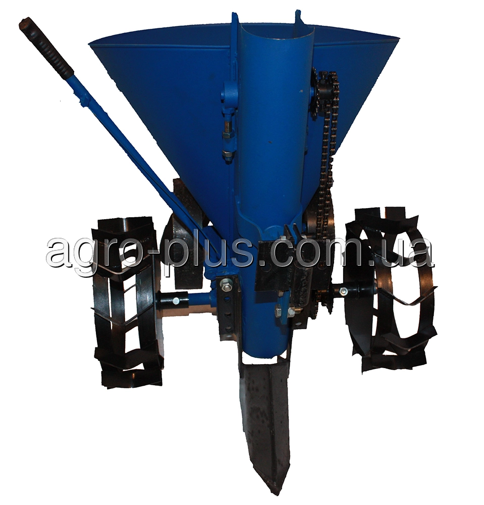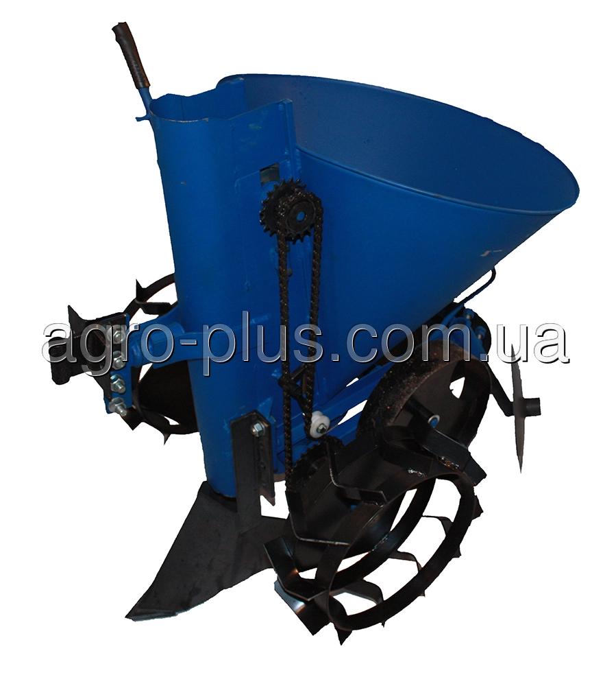 Привод механизма посадки приводится в действия от опорных колес через приводной вал. Вращающий момент с приводного вала передается на механизм посадки через цепную передачу, оснащенную роликовым натяжителем. Натяжитель необходим для исключения провисания цепи после регулирования шага посадки. Регулировка производится путем перемещения цепи на дополнительные звездочки.